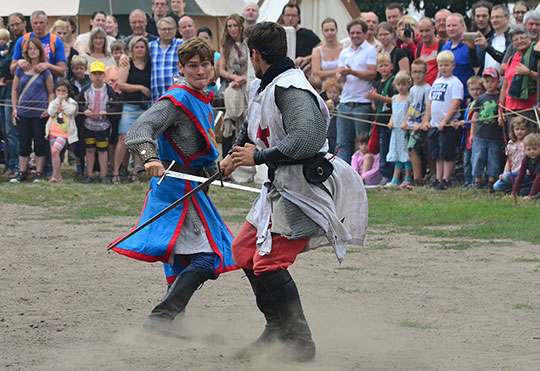 Inhaltlich bot das Spektakel im Georgengarten nicht viel Neues, aber dafür Unterhaltsames und Altbewährtes. Beim "Turney der Kronen Europas" setzte sich vor unseren Augen Heinrich von Hannover souverän gegen Karl Konrad von Cottbus durch - tapfer errang er einen "Oculus" nach dem anderen und scheute auch vor dem Kampf Mann gegen Mann nicht zurück, egal ob zu Pferd oder zu Fuß. Dankenswerterweise wurde hier viel vom oftmals üblichen Brimborium bei Ritterturnieren weggelassen. Es reicht ja auch aus, wenn der Herold die Punkte vergibt und nicht jedes Mal das Publikum abstimmen lässt ("Ich kann Euch nicht hören!"). So wurde das Turnier kurzweilig und spannend.