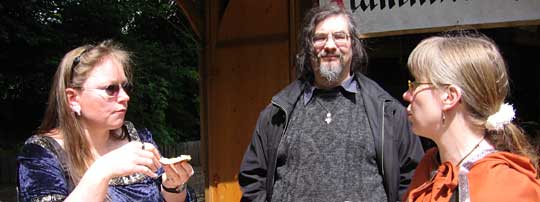 Eigentlich hatte ich mit den Markt ein wenig renaissance-artiger vorgestellt; was uns im Schloß empfing, war meiner Meinung eher ein normaler Mittelaltermarkt... Um so besser, denn da passten unsere Gewandungen natürlich gut. Die kamen uns auch schon beim Lösen der Eintrittskarten zugute, denn als Gewandete brauchten wir nur den halben Preis zu bezahlen :-)