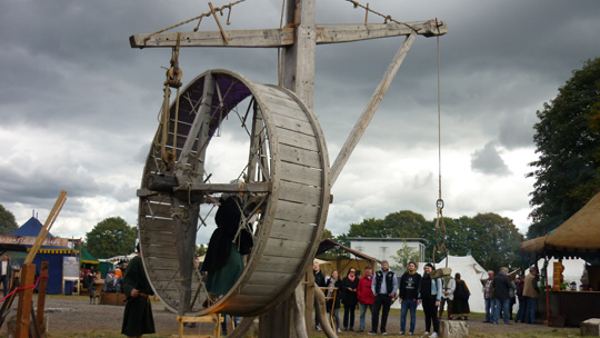 Experimentum e.V. präsentierte einen mittelalterlichen Kran im Praxistest – eine faszinierende Konstruktion, bei deren Vorführung ich gerne länger zugesehen hätte. Dazwischen gab es immer wieder Walking Acts zu bewundern und auch gewandete Besucher stellten sich und unseren Kameras gerne als Motiv zur Verfügung. Besonders angetan haben es mir die Stelzenläufer, Akrobaten und Jongleure der Gruppen Dro Lig und Toroul Boroul. Leider wurden die Greifvögel nur im Inneren vorgestellt, ich hätte gerne einen der Adler oder den Wanderfalken fliegen sehen.