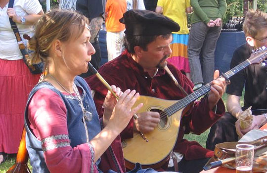 Wer an den Biertischen saß, wurde von den Musikanten oder der Bauchtänzerin unterhalten. Selbst einen mittelalterlichen Tanz konnte man bestaunen. Die "Drachenkinder" waren mit Birgits Hilfe eifrig dabei - unterstützt von den Musikanten.